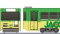 1990年に登場した函館市電の路面電車です。800形の車体を更新した車両です。函館にある本場ドイツのハム・ソーセージ店の全面ラッピング車です。