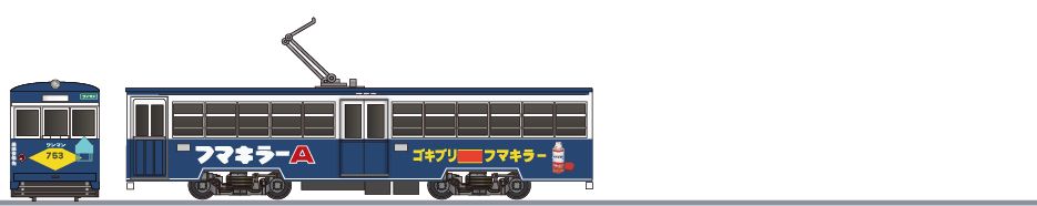 1965年に登場した路面電車です。旧型の1601形、1651形、1801形を統合したグループで、そのため客用扉などに各車違いがあります。1980年頃に運行されていた家庭用品や家電、雑貨などを扱う中国東海商事の広告車です。