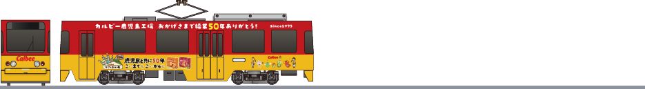 800形の部品を流用して製造された鹿児島市交通局の路面電車です。「ポテトチップス」等のカルビーの鹿児島工場が操業50周年を迎えることを記念し、2025年4月1日からカルビー鹿児島工場オリジナルデザインのラッピング車が登場しました。