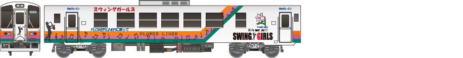 1988年の開業に合わせて投入された新潟鐵工所製の気動車です。映画「スウィングガールズ」のイラストが描かれています。